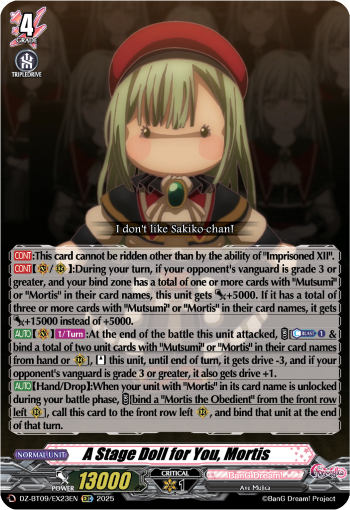 [CONT]:This card cannot be ridden other than by the ability of Imprisoned XII. [CONT](VC/RC):During your turn, if your opponent's vanguard is grade 3 or greater, and your bind zone has a total of one or more cards with Mutsumi or Mortis in their card names, this unit gets [Power]+5000. If it has a total of three or more cards with Mutsumi or Mortis in their card names, it gets [Power]+15000 instead of +5000. [AUTO](VC)[1/Turn]:At the end of the battle this unit attacked, [COST][Counter-Blast 1] & bind a total of two unit cards with Mutsumi or Mortis in their card names from hand or (RC)], [Stand] this unit, until end of turn, it gets drive -3, and if your opponent's vanguard is grade 3 or greater, it also gets drive +1. [AUTO]Hand/Drop:When your unit with Mortis in its card name is unlocked during your battle phase, [COST][bind a Mortis the Obedient from the front row left (RC)], call this card to the front row left (RC), and bind that unit at the end of that turn.