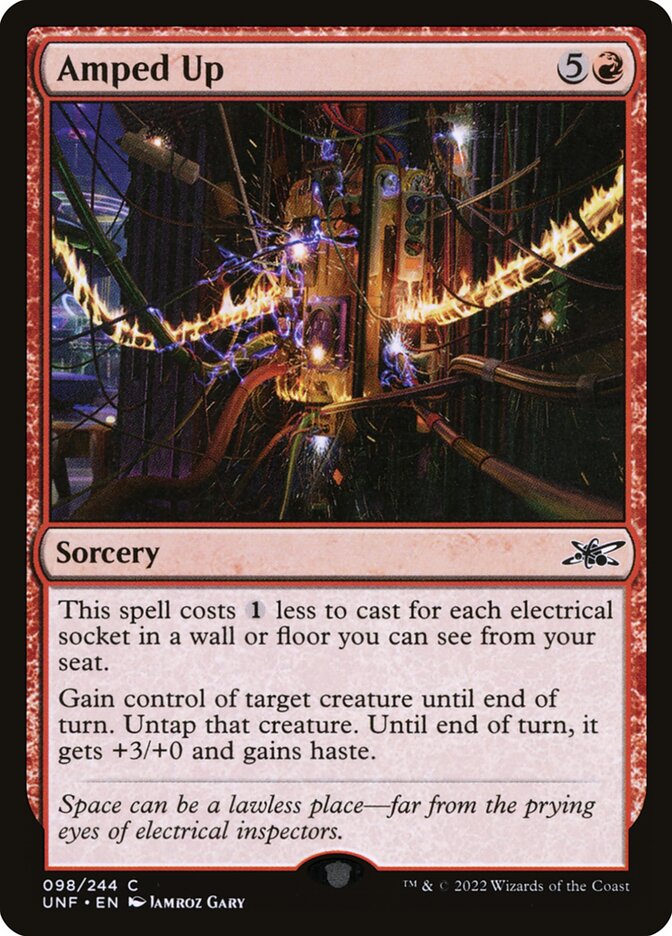 This spell costs {1} less to cast for each electrical socket in a wall or floor you can see from your seat. Gain control of target creature until end of turn. Untap that creature. Until end of turn, it gets +3/+0 and gains haste.