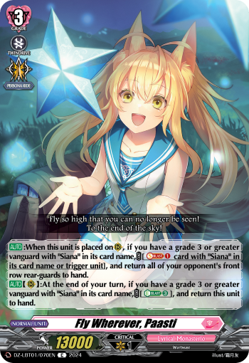[AUTO]:When this unit is placed on (RC), if you have a grade 3 or greater vanguard with Siana in its card name, [COST][Soul-Blast 1 card with Siana in its card name or trigger unit], and return all of your opponent's front row rear-guards to hand.[AUTO](RC):At the end of your turn, if you have a grade 3 or greater vanguard with Siana in its card name, [COST][Energy-Blast 3], and return this unit to hand.