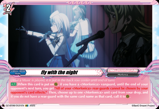 (After a Music is played, it is put in the back row center until end of turn) [AUTO]:When this card is put on (RC), if you have a vanguard, until the end of your opponent's next turn, you get All of your rear-guards cannot be chosen by your opponent's card effects.. Then, choose up to one unit card from your drop, and if you do not have a rear-guard with the same card name as that card, call it to (RC).