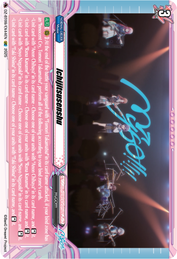 [AUTO](RC):At the end of the battle your vanguard with Tomori Takamatsu in its card name attacked, if your bind zone has an Innocent Cry, Tomori Takamatsu, perform all of the following according to your bind zone's cards. -Unit card with Anon Chihaya in its card name - Choose one of your units with Anon Chihaya in its card name, and [Stand] it. -Unit card with Rana Kaname in its card name - Choose one of your units with Rana Kaname in its card name, and [Stand] it. -Unit card with Soyo Nagasaki in its card name - Choose one of your units with Soyo Nagasaki in its card name, and [Stand] it. -Unit card with Taki Shiina in its card name - Choose one of your units with Taki Shiina in its card name, and [Stand] it.