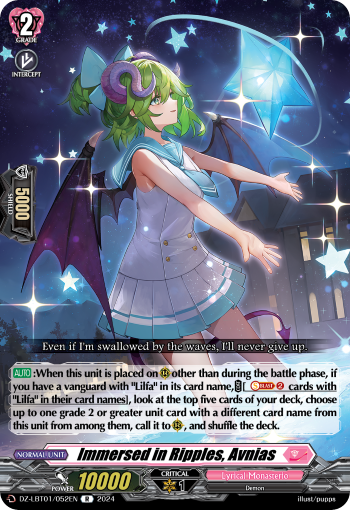 [AUTO]:When this unit is placed on (RC) other than during the battle phase, if you have a vanguard with Lilfa in its card name, [COST][Soul-Blast 2 cards with Lilfa in their card names], look at the top five cards of your deck, choose up to one grade 2 or greater unit card with a different card name from this unit from among them, call it to (RC), and shuffle the deck.