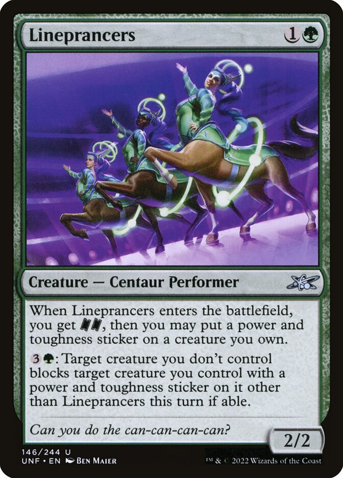 When Lineprancers enters the battlefield, you get {TK}{TK}, then you may put a power and toughness sticker on a creature you own. {3}{G}: Target creature you don't control blocks target creature you control with a power and toughness sticker on it other than Lineprancers this turn if able.