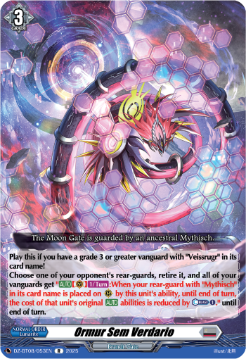 Play this if you have a grade 3 or greater vanguard with Veissrugr in its card name!Choose one of your opponent's rear-guards, retire it, and all of your vanguards get [AUTO](VC)[1/Turn]:When your rear-guard with Mythisch in its card name is placed on (RC) by this unit's ability, until end of turn, the cost of that unit's original [AUTO] abilities is reduced by [Counter-Blast 1]. until end of turn.