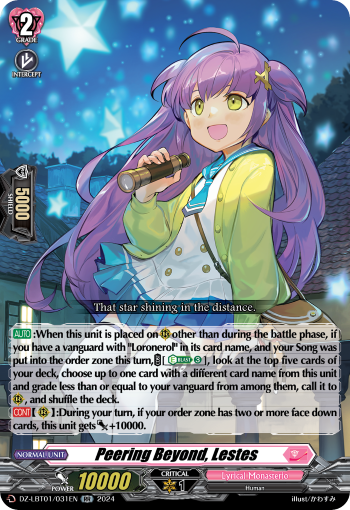 [AUTO]:When this unit is placed on (RC) other than during the battle phase, if you have a vanguard with Loronerol in its card name, and your Song was put into the order zone this turn, [COST][Energy-Blast 3], look at the top five cards of your deck, choose up to one card with a different card name from this unit and grade less than or equal to your vanguard from among them, call it to (RC), and shuffle the deck.[CONT](RC):During your turn, if your order zone has two or more face down cards, this unit gets [Power] +10000.