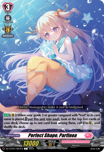 [AUTO](RC):When your grade 3 or greater vanguard with Vert in its card name is placed, [COST][put this unit into soul], look at the top five cards of your deck, choose up to one card from among them, call it to (RC), and shuffle the deck.
