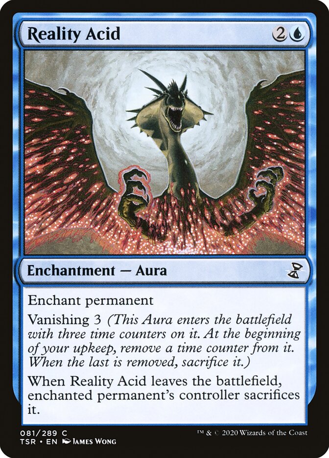 Enchant permanent Vanishing 3 (This Aura enters the battlefield with three time counters on it. At the beginning of your upkeep, remove a time counter from it. When the last is removed, sacrifice it.) When Reality Acid leaves the battlefield, enchanted permanent's controller sacrifices it.
