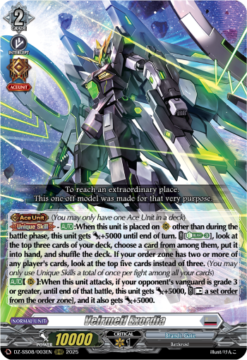 [Ace Unit] (You may only have one Ace Unit in a deck) [Unique Skill] - [AUTO]:When this unit is placed on (RC) other than during the battle phase, this unit gets [Power]+5000 until end of turn. [COST][Energy-Blast 3], look at the top three cards of your deck, choose a card from among them, put it into hand, and shuffle the deck. If your order zone has two or more of any player's cards, look at the top five cards instead of three. (You may only use Unique Skills a total of once per fight among all your cards) [AUTO](RC):When this unit attacks, if your opponent's vanguard is grade 3 or greater, until end of that battle, this unit gets [Power]+5000, [COST][Rest] a set order from the order zone], and it also gets [Power]+5000.