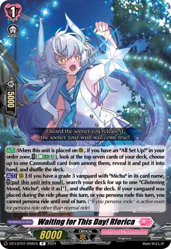 [AUTO]:When this unit is placed on (RC), if you have an All Set Up! in your order zone, [COST][Energy-Blast 3], look at the top seven cards of your deck, choose up to one Cannonball card from among them, reveal it and put it into hand, and shuffle the deck.[ACT](RC):If you have a grade 3 vanguard with Michu in its card name, [COST][put this unit into soul], search your deck for up to one Glistening Mood, Michu, ride it as [Stand], and shuffle the deck. If your vanguard was placed during the ride phase this turn, or you persona rode this turn, you cannot persona ride until end of turn. (If you persona rode is active even for persona ride other than normal ride)