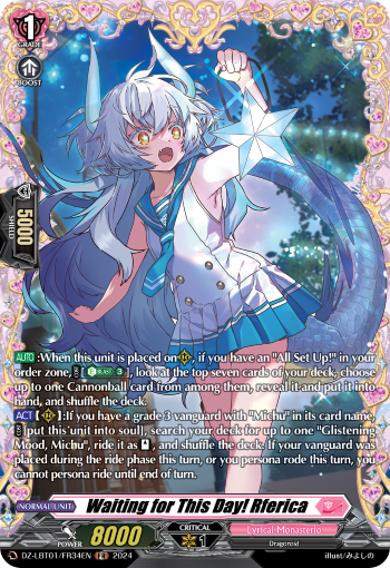 [AUTO]:When this unit is placed on (RC), if you have an All Set Up! in your order zone, [COST][Energy-Blast 3], look at the top seven cards of your deck, choose up to one Cannonball card from among them, reveal it and put it into hand, and shuffle the deck.[ACT](RC):If you have a grade 3 vanguard with Michu in its card name, [COST][put this unit into soul], search your deck for up to one Glistening Mood, Michu, ride it as [Stand], and shuffle the deck. If your vanguard was placed during the ride phase this turn, or you persona rode this turn, you cannot persona ride until end of turn.